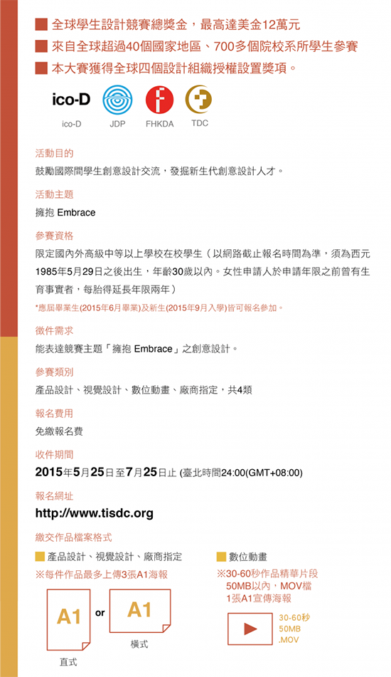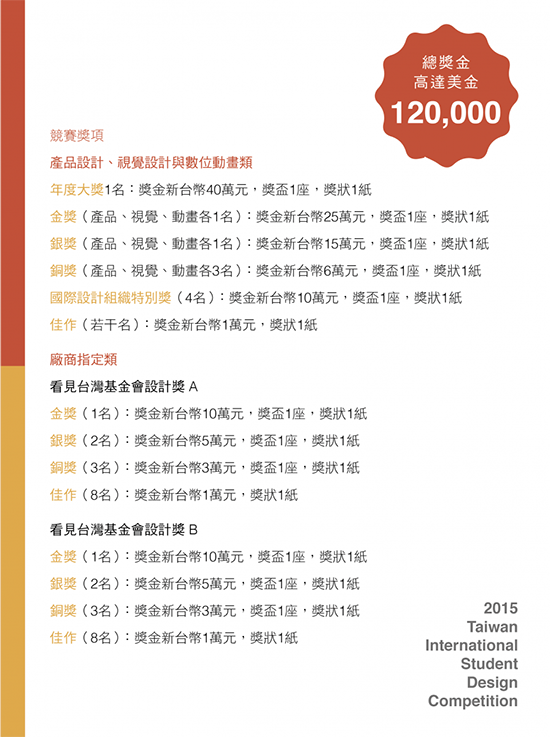 国际设计组织特别奖(4名):奖金新台币十万元,奖杯一座,奖状一纸