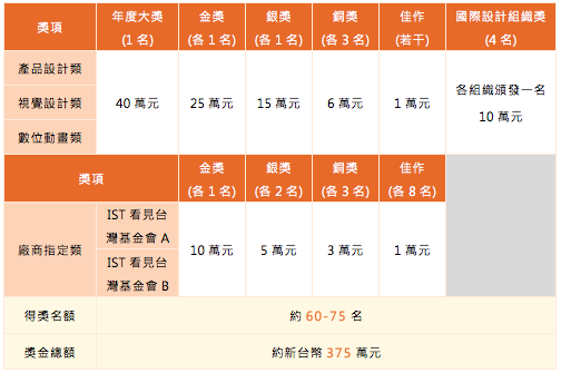 金奖(产品、视觉、动画各1名):奖金新台币二十五万元,奖杯一座,奖状一纸