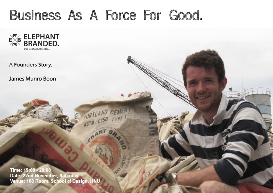 Lecturer: Mr James Munro Boon, Founder of Elephant Branded Description: James set up his own business Elephant Branded whilst at University to help solve the chronic lack for school equipment he had witnessed while working in Africa and Asia.