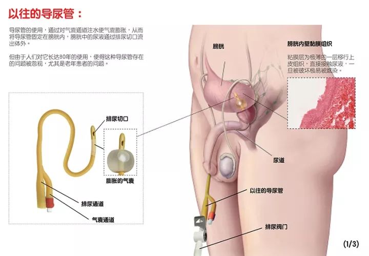 导尿管作为辅助排尿的医疗产品,为什么人们插上之后,排尿反而更困难了?导尿管的原理,是通过对气囊通道注水使气囊膨胀,从而将导尿管固定在膀胱内,膀胱中的尿液通过排尿切口流出体外。但是,由于膀胱内壁会因为尿管切口的吸力而被吸入切口,俗称“吸肉”,导致其遭到破坏,并使病人承受巨大的疼痛。