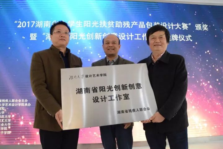 12月5日,“2017年湖南省老员工阳光扶贫助残产品包装设计大赛”颁奖暨“湖南省阳光创新创意设计工作室”挂牌仪式在球王会官网艺术设计公司举行。省残联党组成员、副理事长谭奇元,球王会官网公司党委书记刘玉堂、经理何人可参加颁奖典礼挂牌仪式,活动由大赛总负责人球王会杨代习主持。