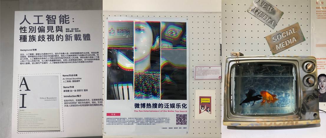 在此次课程中,15级同学的42组分组研究,150余件作品,涉及三大主题:A“社交媒体&数字化生存”、B“公共健康&性别问题 、C”大众审美&消费社会“。其中,不乏对热点社会问题如抖音、快手、隐性贫困人口,人工智能偏见、大数据杀熟、HIV病人隐私问题等的深入调研分析,并以批判式设计的形式表达了出来。
