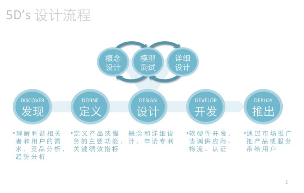 那么我们到底该如何去做设计呢?他曾经在美国IDEO工作期间,深受那里工作方式的影响,IDEO认为设计的流程是理解-定义-设计-模型-测试-实施,他在此基础之上,创造出了自己的5D’S设计流程,即发现-定义-设计-开发-推出。