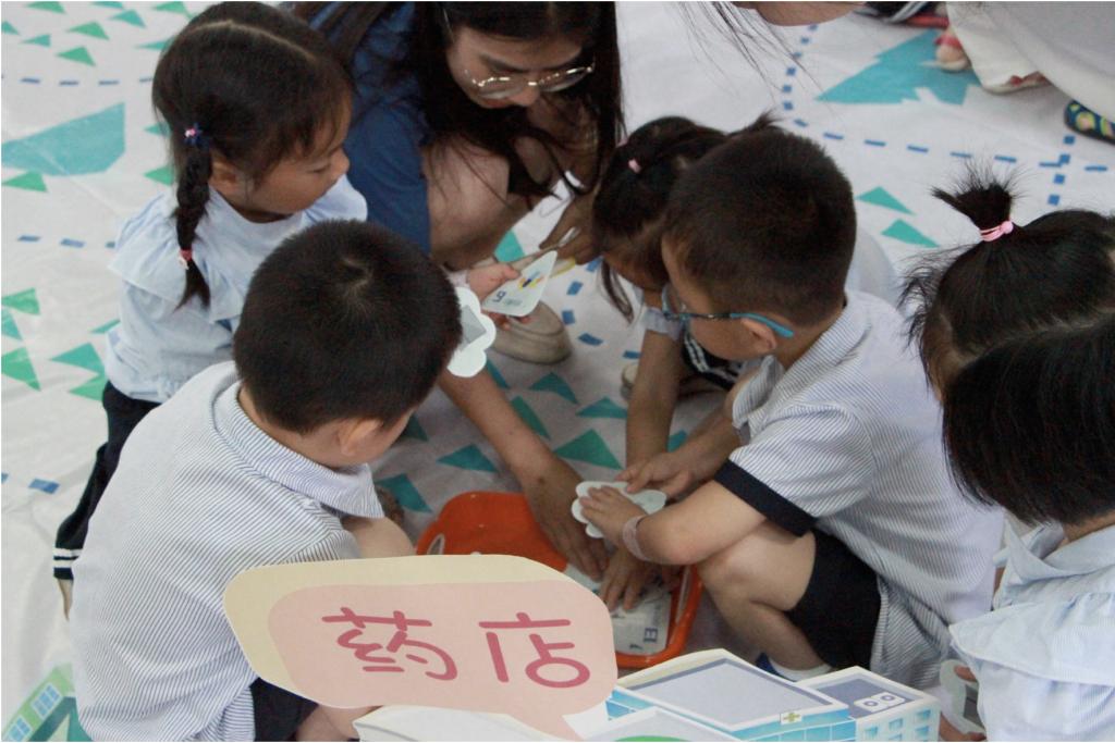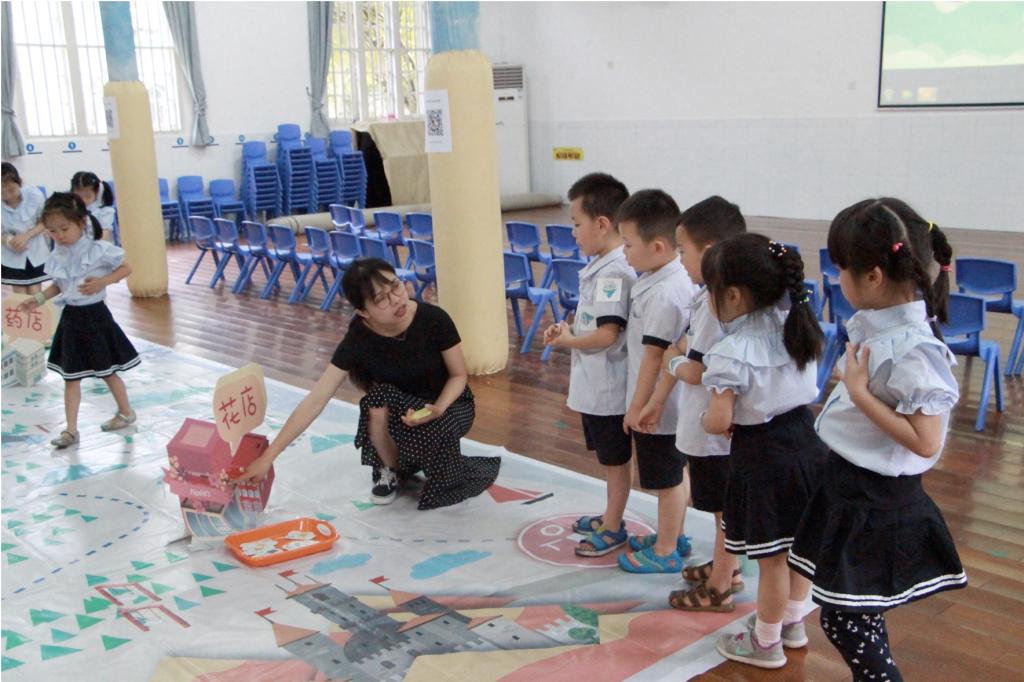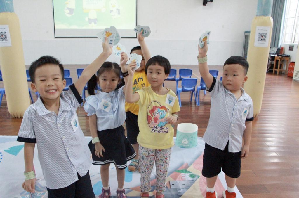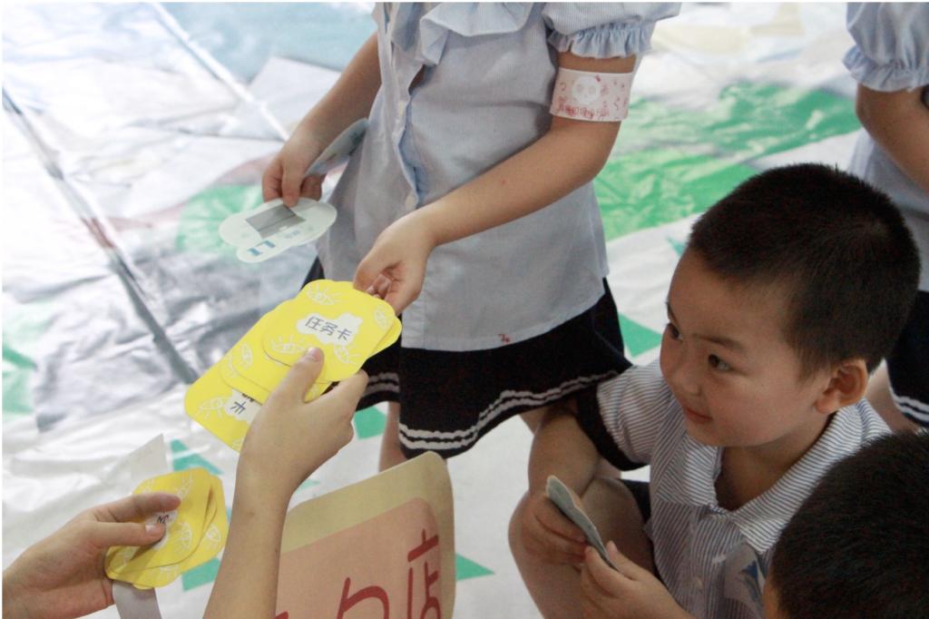 第三环节:“拯救熊猫岛”游戏环节;5名小朋友一组,通过完成任务卡上的答题,收集散落在5个店铺里的一类垃圾卡,按照垃圾卡背后的线路指引去往下一家店,最先收集完并准确放入正确垃圾桶的小组获胜
