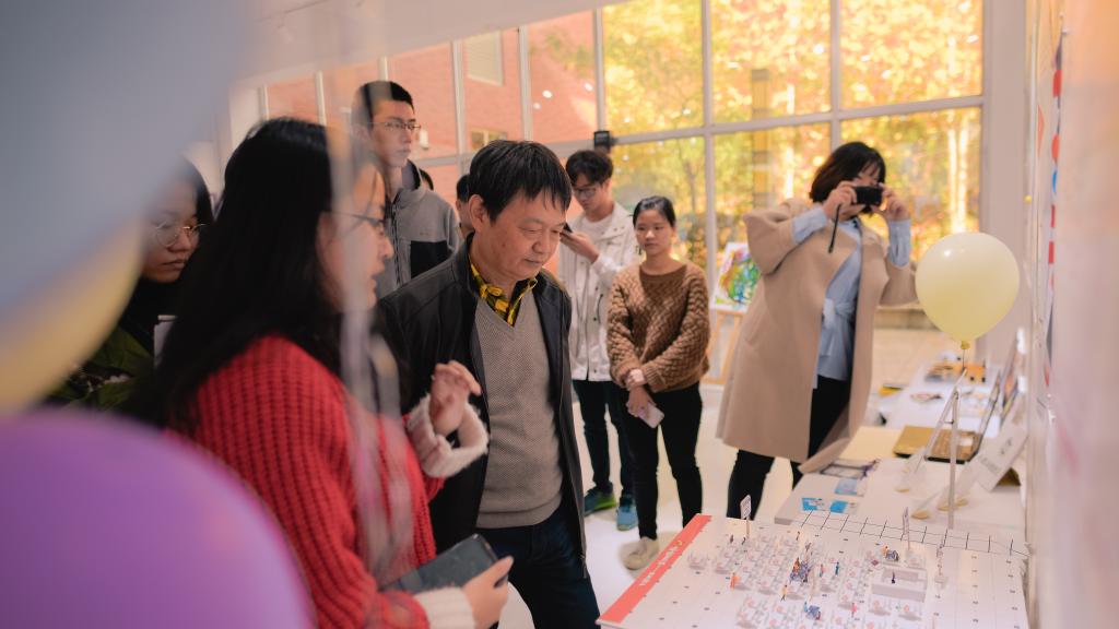 11月28日上午九点三十分,课程指导老师——胡莹老师主持了展览的开幕仪式,邀请刘玉堂书记、袁翔老师和学工部袁宗汉老师等嘉宾发表了致辞,之后展览正式开始。同学们纷纷向观看展览的嘉宾热情介绍了自己的方案,与他们探讨了方案的具体细节、功能与可操作性,大家都表示,与老师、前辈们的交流,让自己受益良多。