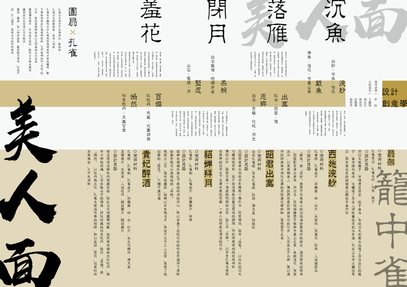 以中国四位美人西施,昭君,貂蝉,玉环的“沉鱼落雁,闭月羞花”之典进行扇面立体创作。