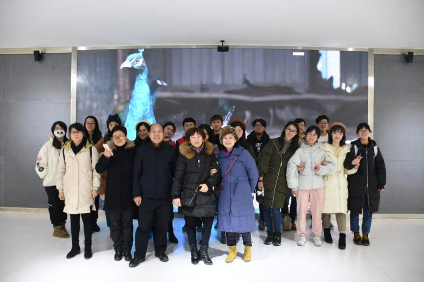 最后,旭蓝孔雀养殖基地董事长郭春生先生前来参观同学们的作品,并且合影留念。
