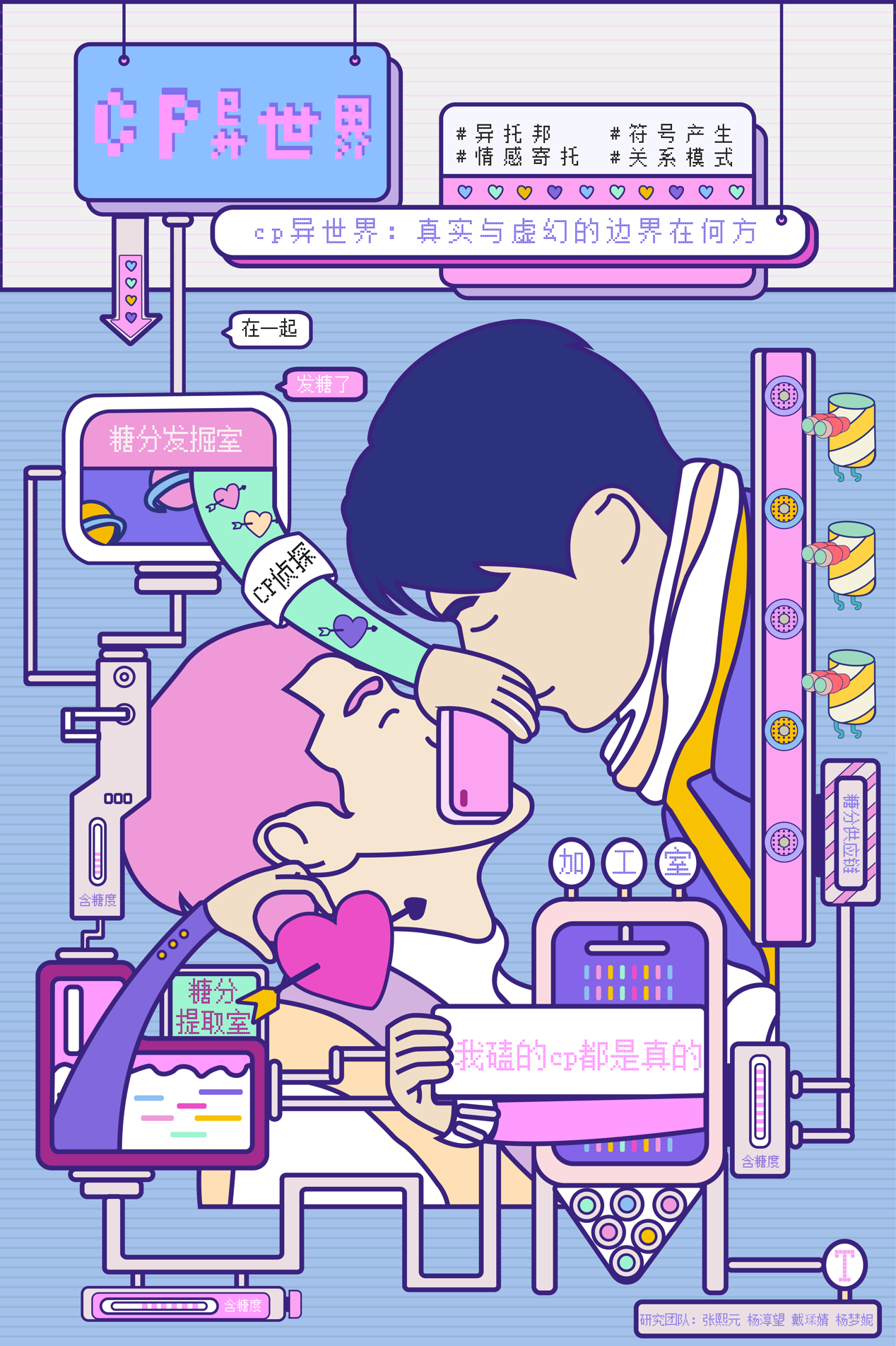 cp是coupling或couple的缩写,指的是情侣、配对,CP 粉丝将感兴趣或喜欢的人物进行配对,组成CP。伴随着各种娱乐节目的粉丝营销,CP 文化也逐渐成为现象级的流行文化。我们在设计批评这门课程中,主要分析CP 粉丝如何组成空间意义上的实践 ,用异托邦理论看这个空间结构中的符号生产 ,探究泛CP 文化对人们心理建设和文化建构的影响。