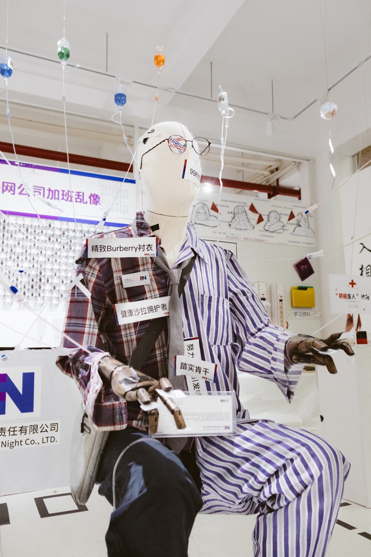 996.ICU 是互联网公司加班现象的代名词,我们虚构了“桃子湖好梦责任有限公司”的一场“优秀员工表彰大会”,通过打造一个优秀员工的“雕塑”以及一个迎宾台来讲述996和老板员工的故事。996现象的背后包含了基础教育出现的问题、过高的房价导致阶层越阡越来越难等等。我们的5件展品紧紧相互关联,为观展者打造一个连续流畅的体验。