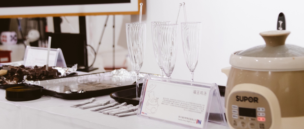 当我靠近这个展览区域时,便有“专业的”营业人员为我进行业务介绍,“原来还在营业”像自助果汁一样,调制了一杯用巧克力加班小人制作的咖啡,小人融化在咖啡里的时候,就拯救了一个身陷996的上班族,然后享受咖啡时光。给我的感受是:在不知不觉中经历了整个设计流程,恍然发现拯救了996原来这么简单。打破了一般看展览的常规感受,印象深刻。虽然是付费的,但性价比很高。”一位被展览吸引的路人学姐看完“批评设计展课题之一:996.icu:现代青年人加班现象”后的感受。