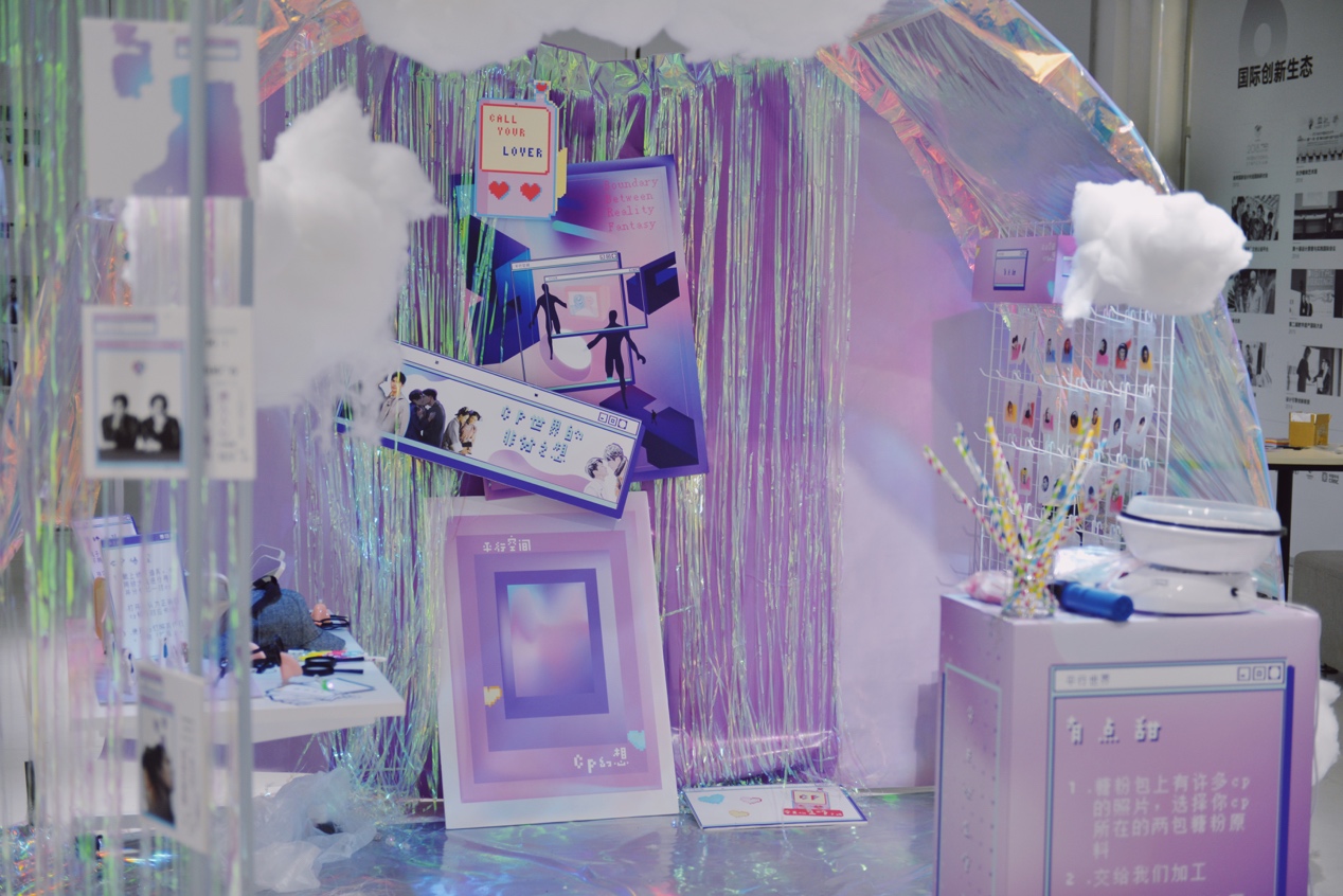 “看到这个展览的时候,竟然羞涩的会心一笑,这不就是天天对着手机吃糖的室友吗?这个话题对于当下年轻人来说真的很敏锐,在单身大军越来越庞大的当下,嗑CP糖就是“自杀式单身”“百年孤独”人群的粉红泡泡的来源。在CP年代,“万物皆可P”,展览现场的棉花糖机和照片装置都很有趣的展现了CP党的虚拟制糖心理。”一位捂着嘴满脸羞涩的CP粉不停的摆弄着课题“魔仙堡的“希望cp”、“梦境cp”的展览装置。