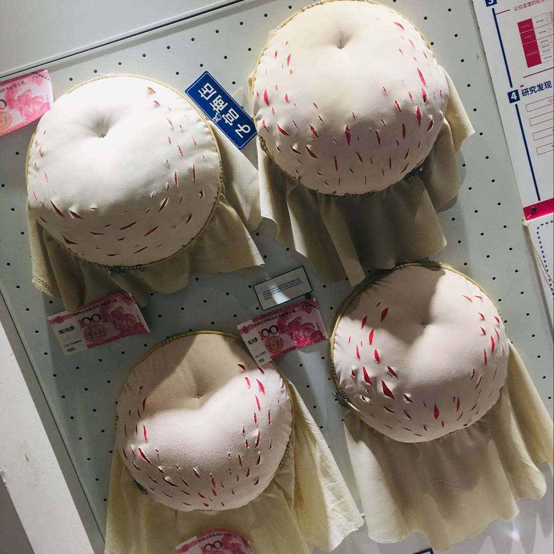 “对于这个看似隐藏在大众视角后的灰色话题,竟然被他们抓住并很巧妙地表现出了痛点。印象最深刻的是那个用布和枕头模拟的大孕肚,上面被小刀划开的丝丝裂裂的小口子,不正是每一个妊娠纹背后的伤害吗?视觉刺激很深刻。整个设计的展位虽然不大,但是进入他的视频故事和展览区的时候就不由自主的沉浸在这个话题里了。视频和海报都很精准的抓住了最痛最痒的那些感受。”———站在“摆渡人:代孕”课题展前,一位观展者陷入神思。