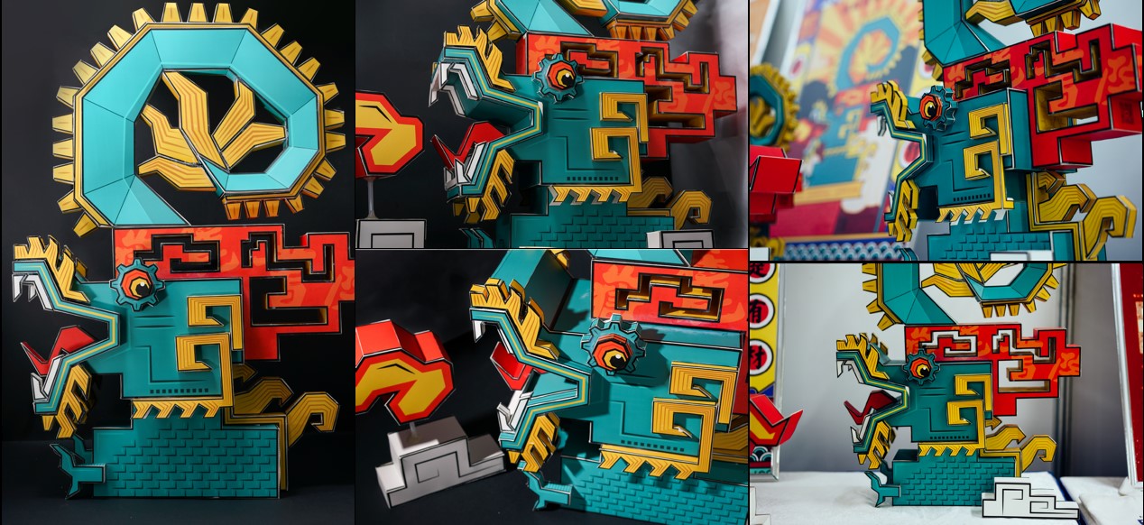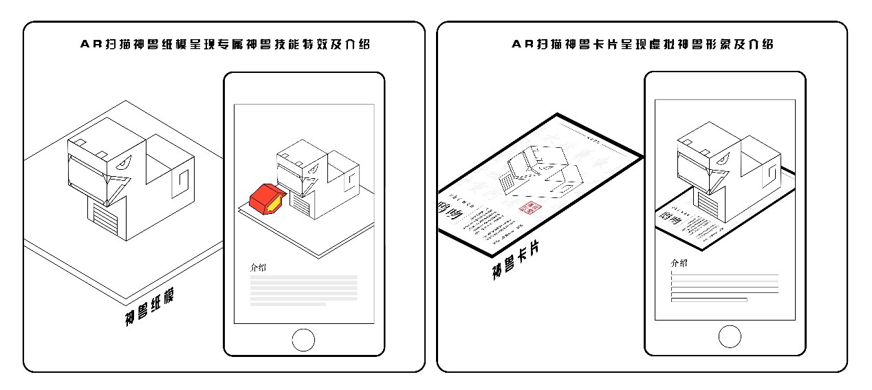 书院神兽纸模设计是将岳麓书院中屋脊吻兽形象提取并设计成为独具书院风格的纸质模型玩具。神兽纸模是以书院屋脊吻兽形象为原型卡通化设计,并提取岳麓书院环境中鲜明配色,制作具有高识别度与浓重书院文化色彩的文创产品,同时在该设计中加入AR增强现实交互技术,使用配套APP扫描该模型可呈现该神兽的专属技能特效及相关介绍,增强该产品的交互趣味性,寓教于乐。旨在消费者在体验该产品的同时了解书院文化,在外来IP形象风靡的大环境中建立并宣传中国传统历史文化及形象。