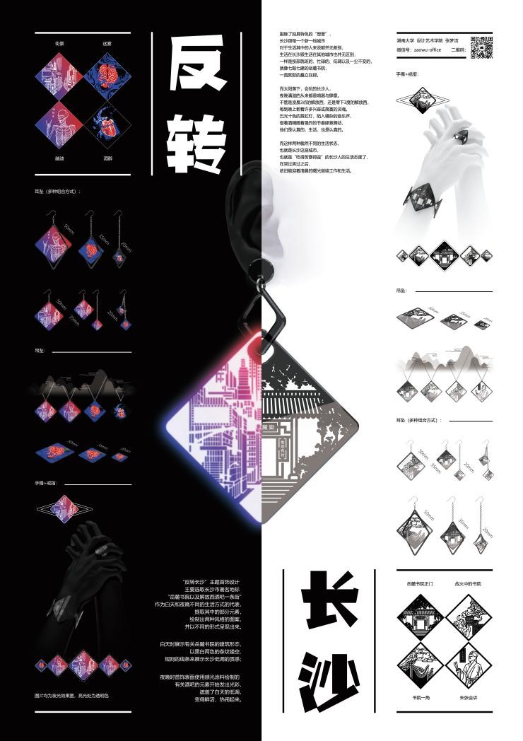 白天的长沙永远是按部就班的、忙碌的、低调的;而太阳落下,会玩的长沙人,夜晚满溢的从来都是喧嚣与肆意。“反转长沙”主题首饰设计选取长沙市著名地标“岳麓书院以及解放西酒吧一条街”作为白天和夜晚不同的生活方式的代表,提取其中的元素,绘制出两种风格的图案,并以两种截然不同的形式呈现出来。白天时展示有关岳麓书院的建筑形态,以黑白两色的条纹镂空、规则的线条来展示长沙低调的质感;夜晚时首饰表面使用感光涂料绘制的有关酒吧的元素开始发出光彩,遮盖了白天的低调,变得鲜活、热闹起来。