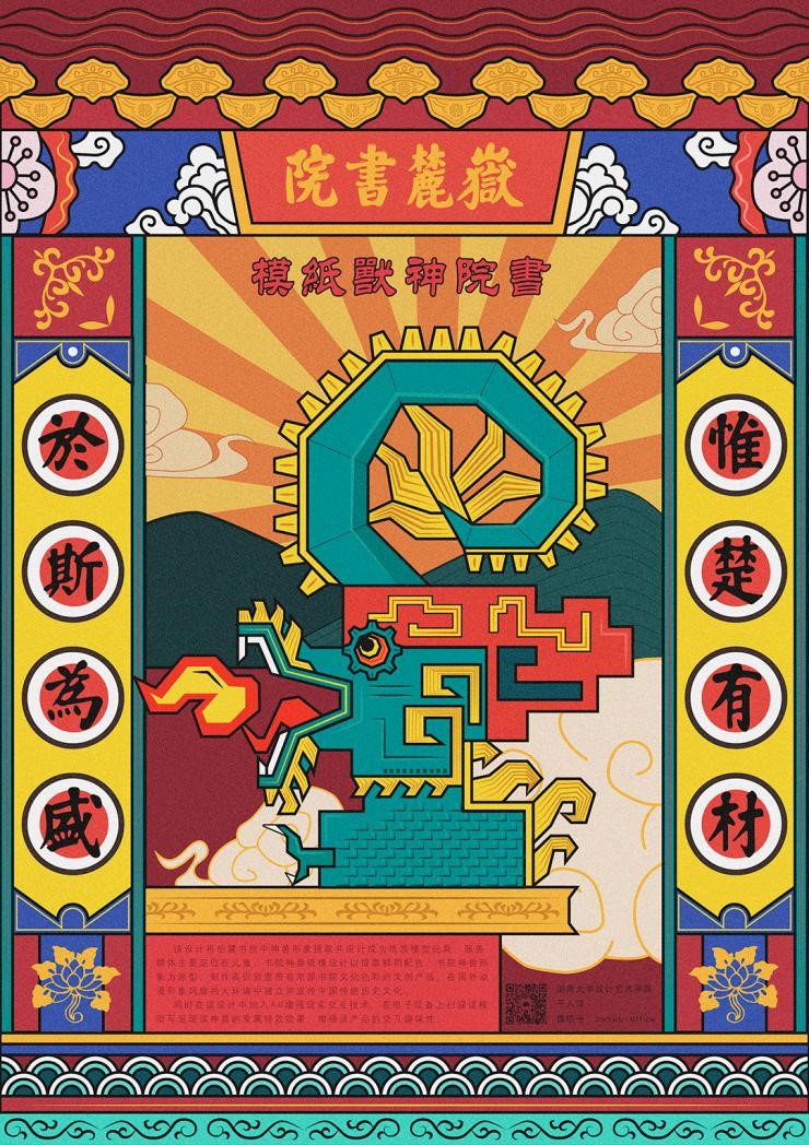 依据中国古代阴阳五行的元素选择了岳麓书院中五种最具有代表性的神兽,从神兽的起源出发,对于神兽的造型和配色采用了创新性的设计,并将其运用于服饰的设计上。主要设计的服饰图案位于连帽、领口和胸口,对于位于服饰不同部位的图案,以神兽抽象化图案为基础,进行了创造性的变形改进,使得神兽的元素和用户之间产生更好的共情,更具趣味性和故事性。在引起用户好奇心的同时也是岳麓书院文化的潜移默化,更利于文化的传播。