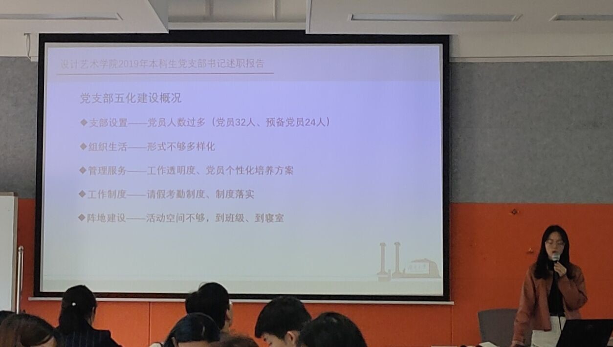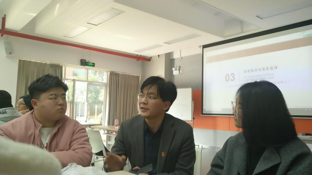 接着支部书记伍佳琦老师结合党支部“三会一课”和“五化”建设,从“组织开展主题教育情况”、“严格党员教育管理”、“联系服务群众”、“改进工作作风”四个方面进行全年党支部工作汇报和问题检视。全体党员对支部工作进行评议。
