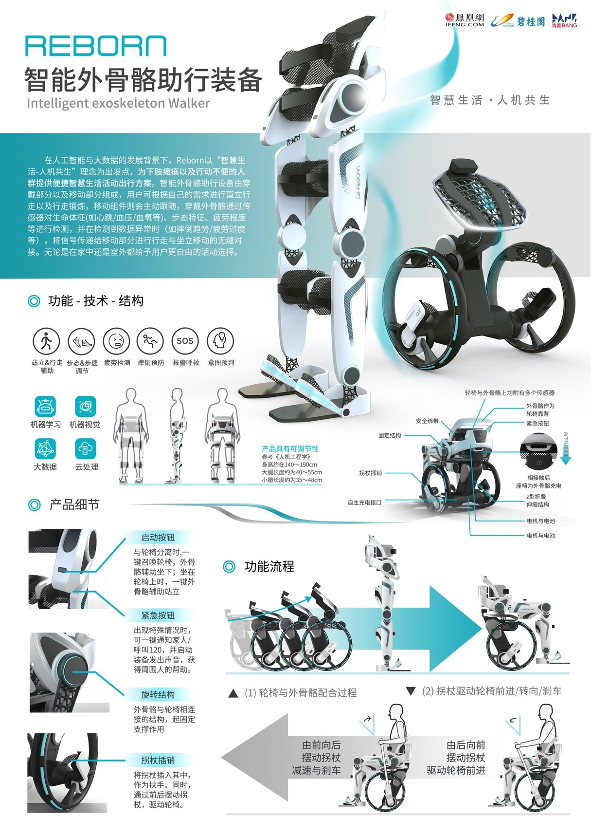 铜奖获奖作品(团队成员:尹家俊,王钦,于闻燕)“Reborn智能外骨骼助行装备”以“智慧生活·人机共生”理念为出发点,为下肢瘫痪以及行动不便的人群提供便捷智慧生活出行方案。