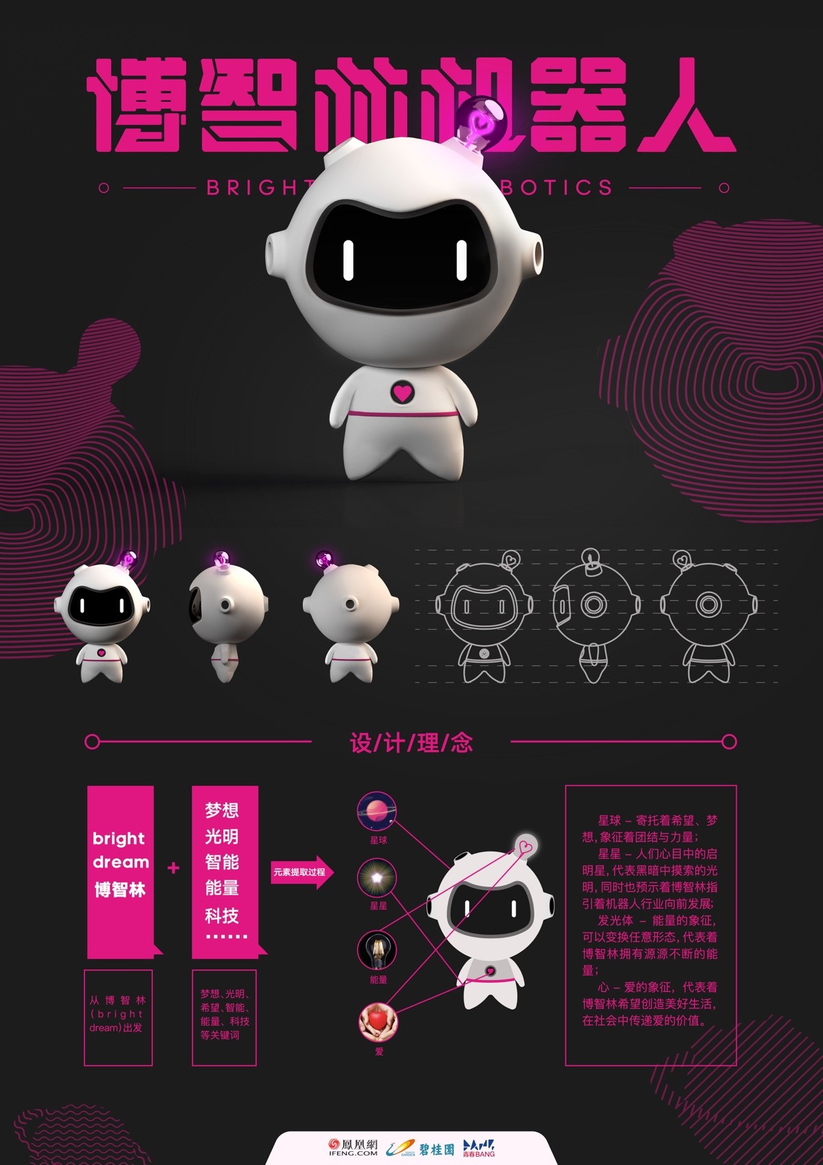 银奖获奖作品(团队成员:于闻燕,王钦,尹家俊) “小智星IP形象设计”的诞生来源于博智林本身bright dream理念,设计团队提取了电路,机械,星球等元素,同时结合关键词梦想,光明,智能,能量,科技等创作了“小智星”。