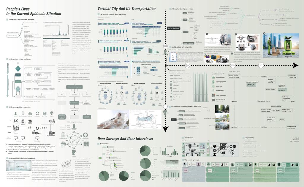创意说明: 这是一种适应未来垂直城市的弹性交通系统,该系统在日常运行和疫情时具有不同的运作模式,以在疫情产生的每个流程进行弹性响应。系统由满足人的日常出行的共享电梯、公共电梯、应对紧急情况的紧急救援舱和满足人的日常生活物资需求的物流电梯组成。在疫情时公共和共享电梯限制运行,隔离单个建筑,紧急救援舱进入楼内工作,物流电梯满足被隔离在家的人的基本生活物资需求。