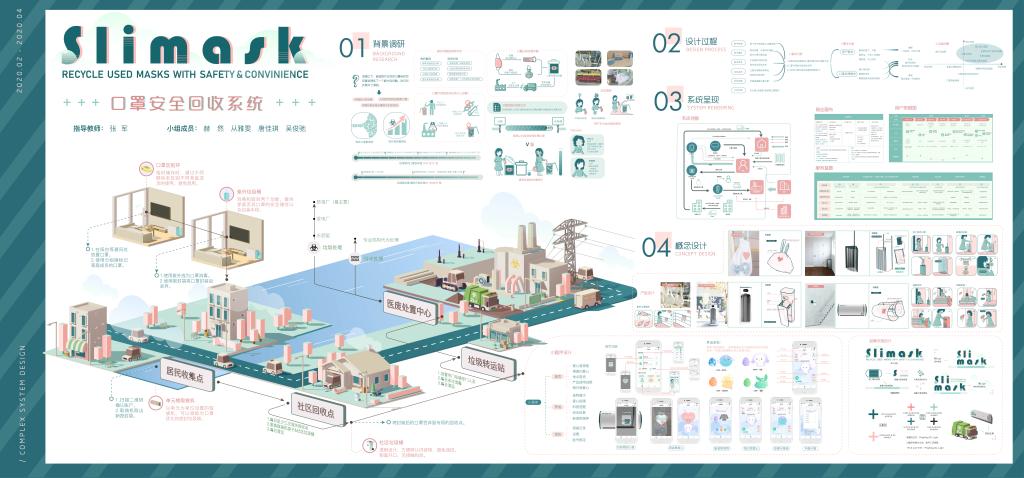 创意说明: 疫情之中口罩消耗数量激增,然而绝大多数居民并未妥善处理废弃口罩,因而带来了诸多隐患。Slimask-口罩安心管家是一套针对废弃口罩回收的系统性解决方案,包含四件产品、一款小程序及配套科普手册,通过提供便捷、有趣的方式来引导居民在家庭和社区中合理地处理和丢弃口罩。