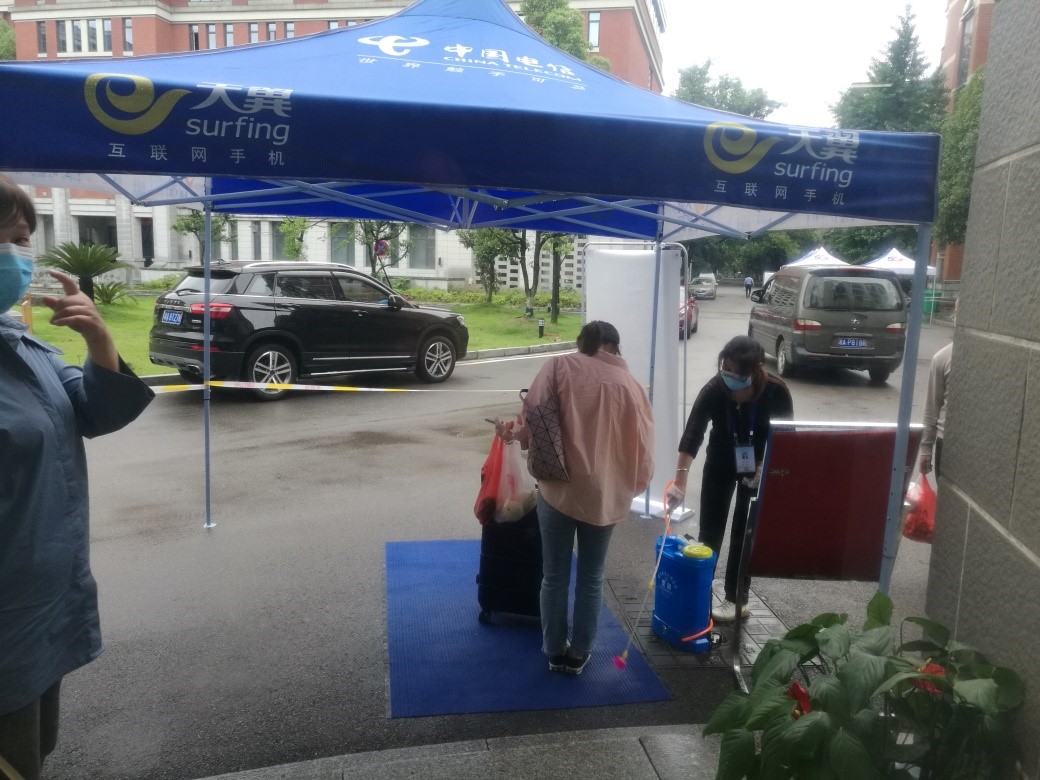 图中,成同学正在接受扫码报到、测温登记、行李消毒等一系列返校报到流程。