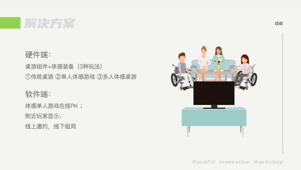 RaceFit体感足球桌游是一个通过结合上肢动作的体感型足球桌游 来解决长期行动不便人群因为日常活动困难而导致的社交娱乐问题的产品