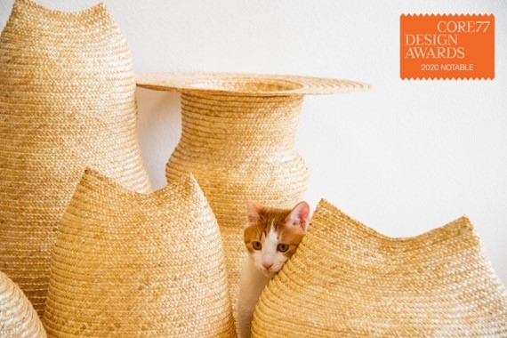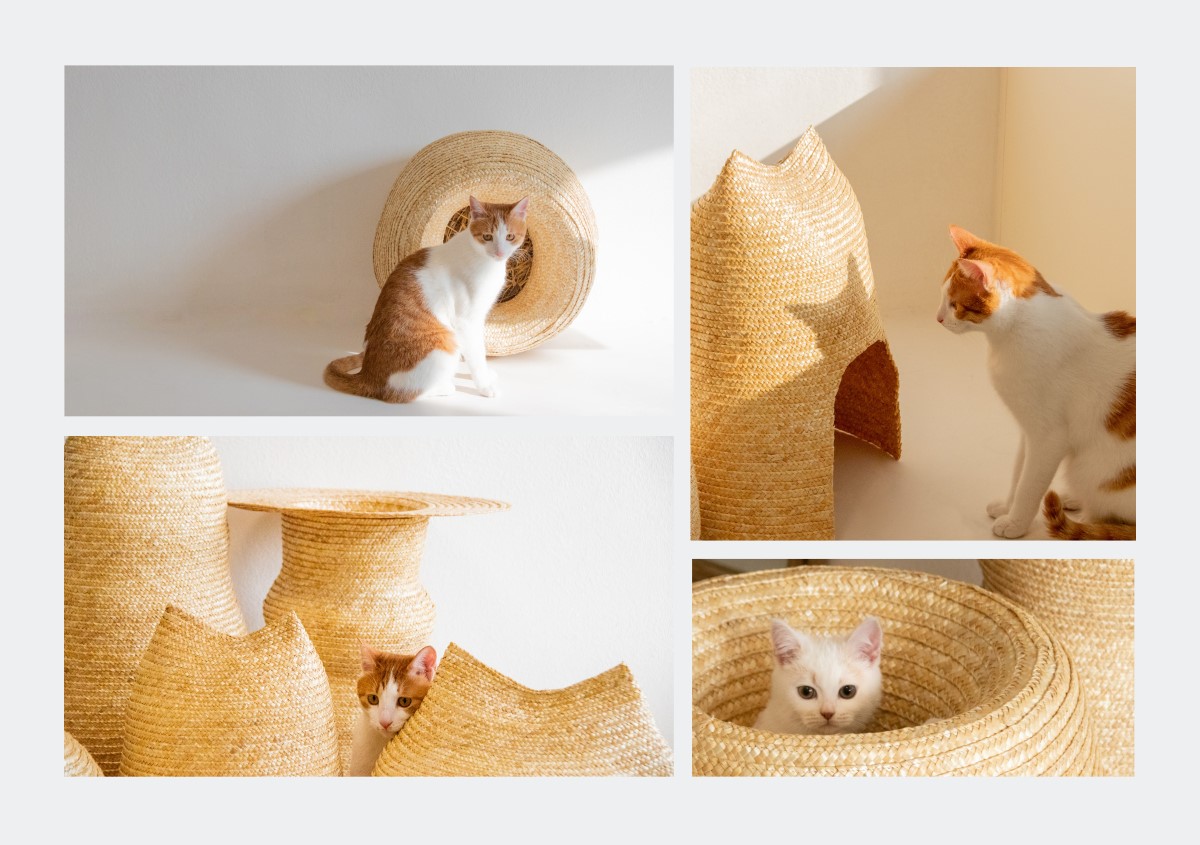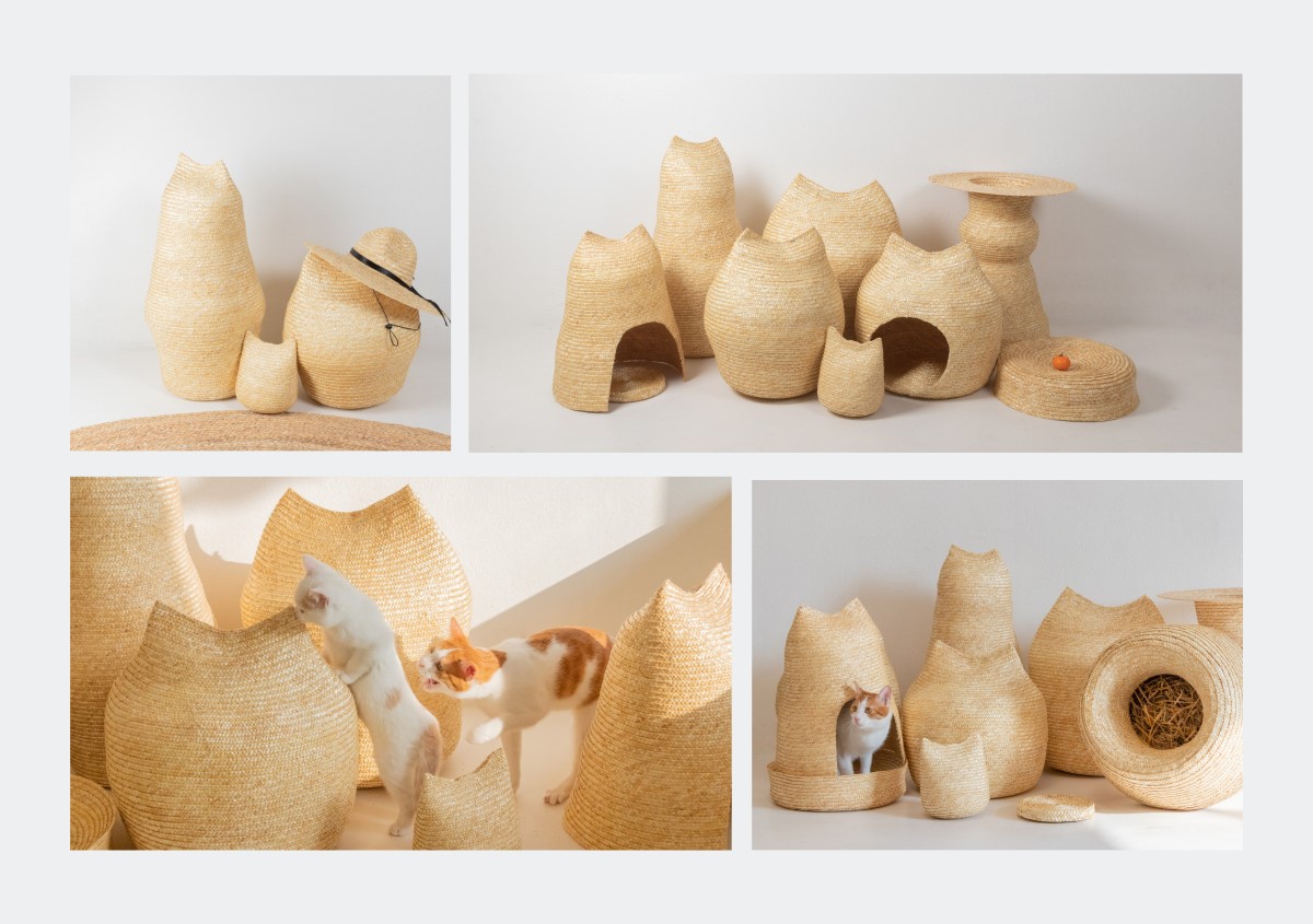 麦秸以往经常由于占用大量耕地并且降解缓慢而被村民焚烧,但他则从降解缓慢中看到了麦秆作为可持续材料的巨大潜力,为此,他利用秸秆材料进行大量材料实验尝试,并最终以传统手编草帽为灵感设计出这套妙趣横生的 WHECAT(麦草猫)系列可降解猫窝,以一种抽象猫咪形象,转可持续痛点为可持续机会点。