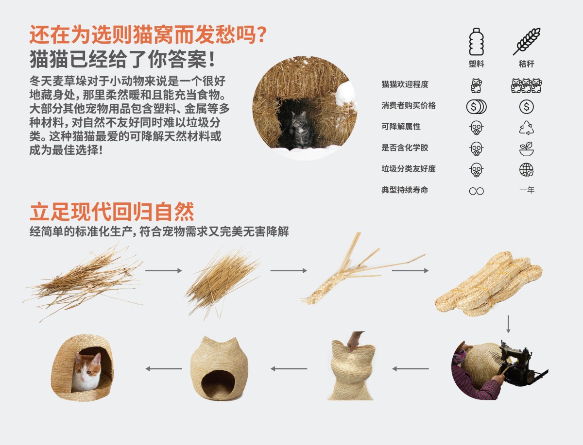 周子韧同学的 WHECAT 麦草猫项目针对秸秆焚烧和其背后的社会问题进行了一系列设计探索,希望参与帮助解决乡村普遍存在的秸秆焚烧问题。通过低技术且简单的加工方式将麦秸秆加工成可降解宠物猫窝和流浪猫窝,从而赋予秸秆更高的经济价值,为村民提供将其焚烧之外的更优选择。