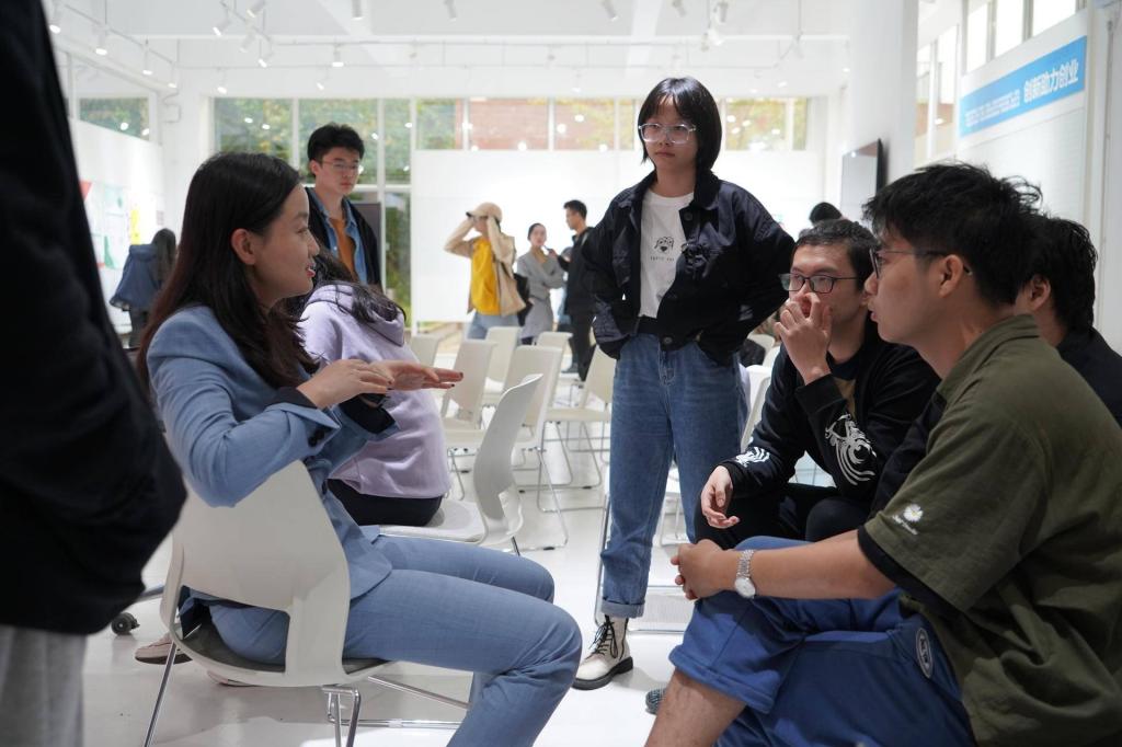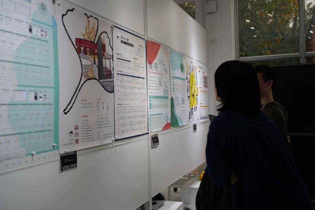 展览现场,同学们通过展板、视频动画、产品原型等多种方式展示设计成果,并向观展教师汇报方案。老师们与同学们交流观展心得并向同学们提出建议和指导。