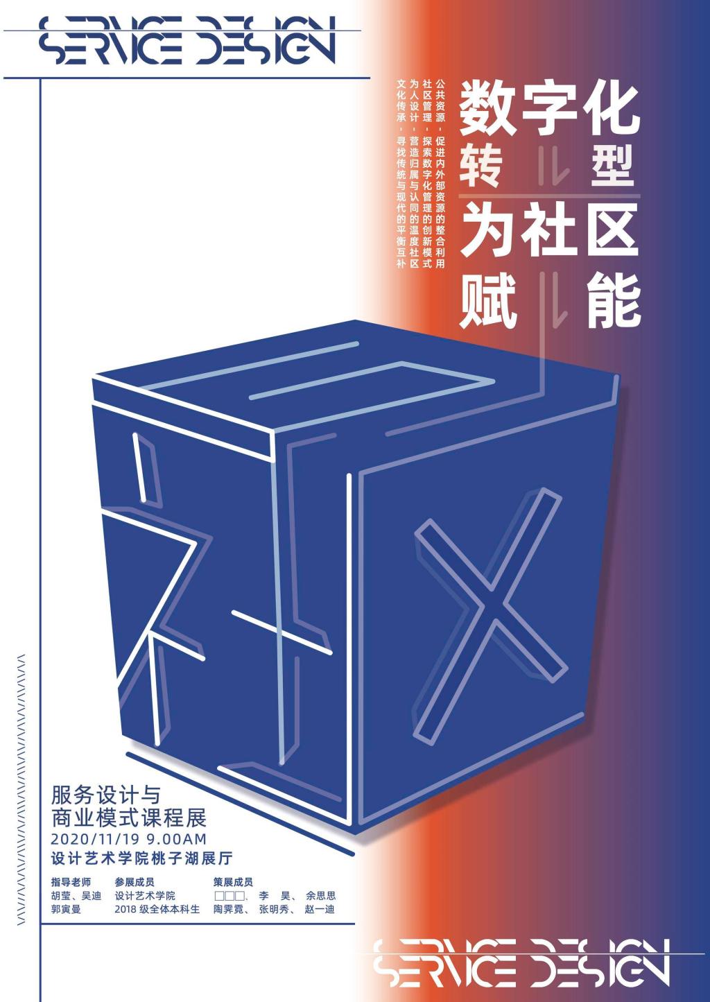服务设计与商业模式是同学们走进服务设计的第一门课。通过此次课程和展览,同学们初步具有了服务设计与商业思维。通过课程实践,同学们掌握了服务设计的工具与方法,学会了从服务设计的角度解决实际问题,同时对社区赋能和数字化转型中设计的介入有了更深刻的理解。