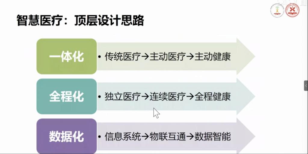 黄教授提出智慧医疗的顶层设计思路,结合未来老龄化和家庭护理不断普的趋势,智慧医疗医疗健康一体化、全程化与数据化的特点,并以院内院外一体化医疗健康全过程服务为例,展示医疗健康一体化这一全闭环、同质化、以患者为中心的医疗健康落地服务生态。