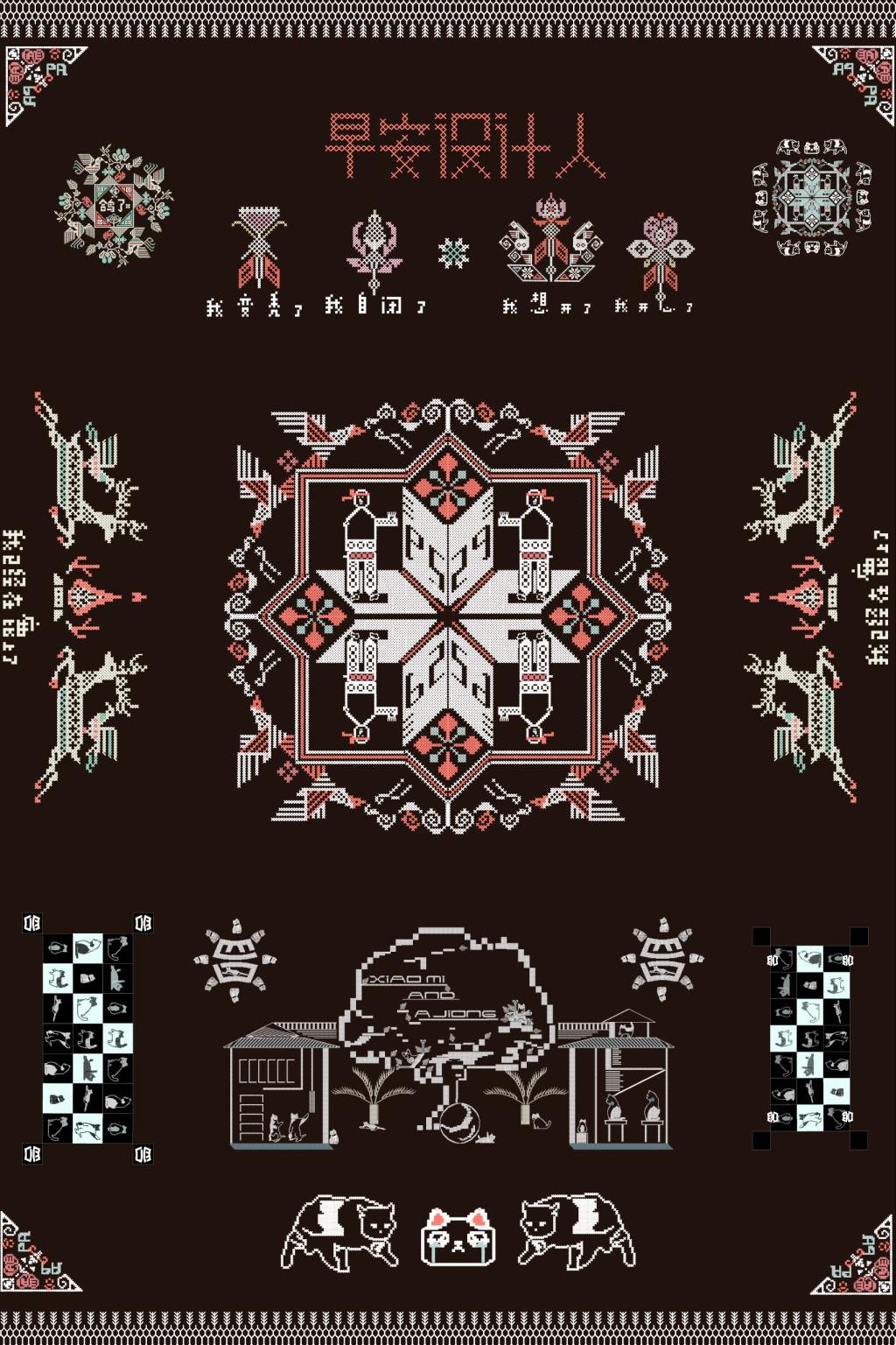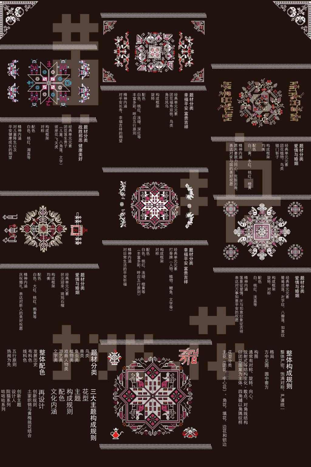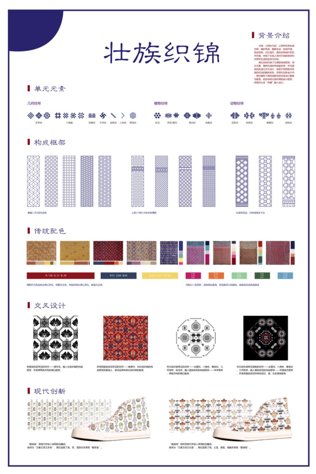 介绍:壮锦,以棉纱为经,以各种彩色丝绒为纬,编织而成。图案生动,结构严谨,色彩鲜明,对比强烈,具有浓艳粗犷的艺术风格,体现了壮族人民对天地的崇拜和对美好生活的追求与向往。我们总结归纳了壮锦的构成框架、单元元素、精神内涵和传统配色等,并与苗族挑花进行交叉设计,探索不同民族间传统纺织品的融合新生。在现代创新设计中,我们摒弃了具有局限性的传统图案与配色,结合传统壮族织锦的设计框架,将现代社会“热梗”融入设计,进行创新设计。