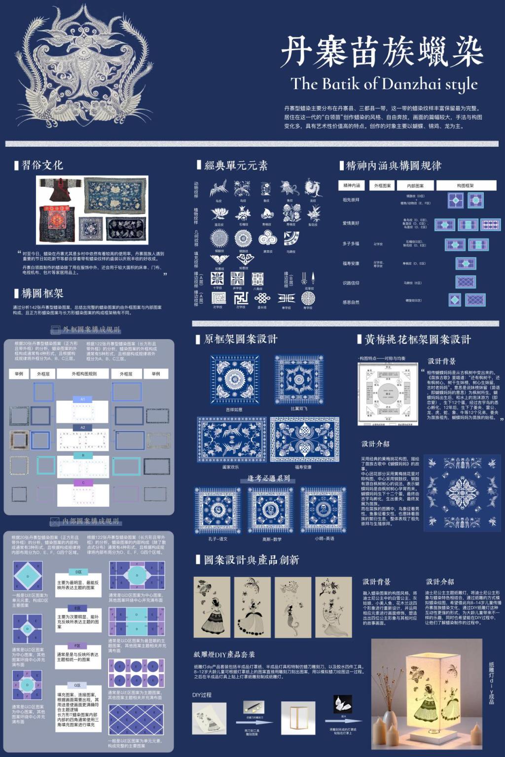介绍:本次课程收集并分析了贵州苗族地区的丹寨型蜡染,总结和归纳了丹寨型蜡染图案的基础图案与构图法则。其中通过分析240张蜡染图片,发现组成蜡染图案经典单元元素主要包括鸟纹、鱼纹、龙纹、蝴蝶纹为主的动物纹样,莲花纹、石榴纹、寿桃纹、梨花纹为主的植物纹样,铜鼓纹、蕨菜纹、马蹄纹为主的几何纹样,以及各式填充纹样。同时通过分析142张由外框图案与内部图案构成的完整蜡染图案,总结出外框构图的五种形式,以及七种较常见的内部图案的填充布局。最后对丹寨型蜡染进行了重设计,用原构图框架创作了“逢考必过”系列图案,用黄梅挑花构图框架创作了《蝴蝶妈妈》叙事性图案,以及融入蜡染图案设计风格设计了“迪士尼公主”主题纸雕灯。
