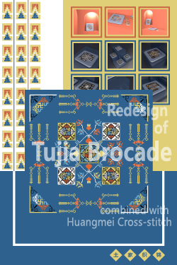 介绍:“黄梅有女皆挑花”。黄梅挑花是以楚文化为基础的中原文化与吴越文化、移民文化(巴苗土家为主)交融的产物,并受到佛教与黄梅戏影响。其寓意主要为富贵吉祥、爱情婚姻、健康美好。图案则有鸟兽鱼虫、植物、戏曲人物、游艺与文字,凤、卐与戏曲元素颇为常见。黄梅挑花构图讲究对称均衡,以团花为主,四角辅以纹样。善用五行色,尤喜黑红,颜色热闹。多以群青或黑为底,骨架为白,红黄与少量蓝绿填充。在此基础上本组在传统构图配色法则、主题与图案等方面做出诸多尝试,设计了一系列创新挑花。