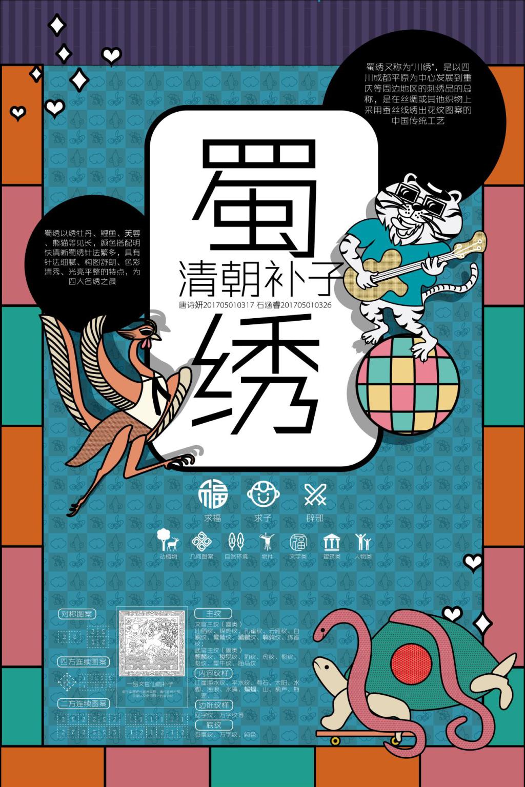 介绍:蜀绣又名“川绣”,与苏绣、湘绣、粤绣齐名,为中国四大名绣之一。作为中国刺绣传承时间最长的绣种之一,蜀绣以其明丽清秀的色彩和精湛细腻的针法形成了自身的独特韵味,丰富程度居四大名绣之首。本次主要研究蜀绣的题材寓意(代表为熊猫、鲤鱼、芙蓉等)、构图法则(宋代以后主要为蜀绣画)、配色原理,并对常见的蜀绣服饰进行分析,以清代补子为例,进行详细分析。补子,简称为“补”,是明清时期在官服胸前或后背上织缀的一块圆形或方形织物。根据官位不同,纹样形式亦不同。文官的补子图案用飞禽,武将的补子用猛兽。补子主要由背景、边框、主纹饰、海水红崖、太阳几部分组成。根据补子的原则,我们以朱雀、神武、白虎、青龙为题材进行了图案再设计。