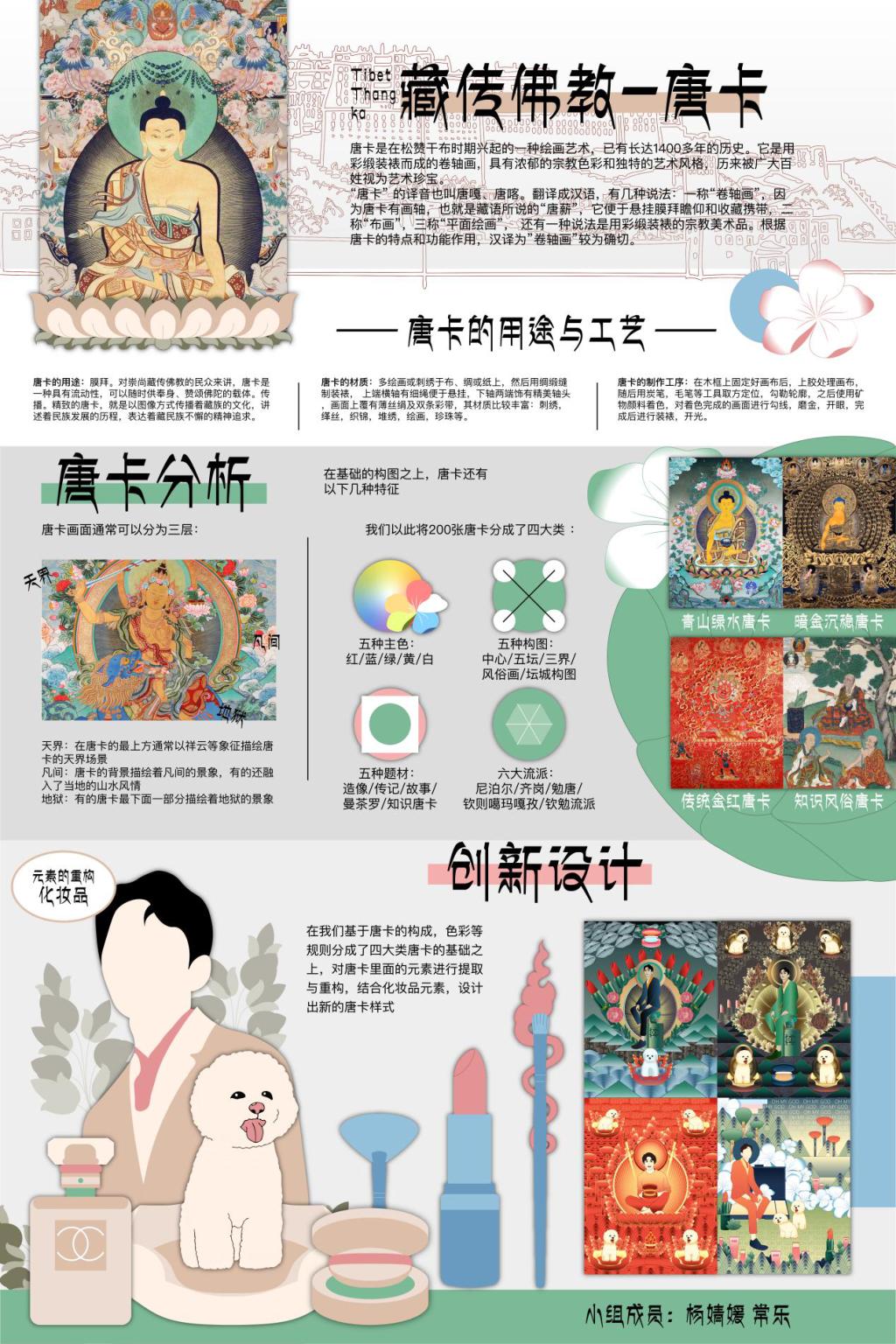 介绍:对藏族唐卡进行桌面调研后,我们分别从色彩、构图、流派、题材四方面将其分类,并采用数据图形分析的方法,用SPSS将百张唐卡归为青山绿水、暗金沉稳、传统金红与知识传记四大类别,再从中抽选几张代表性的唐卡进行分析,总结各类构成规则,通过AI绘制其模板,同时解读其中元素符号的内涵。调研结束后,通过结合当下的时代潮流元素进行设计创新与画面重构,将唐卡元素与蜀绣构图结合,创新出具有时代特点的文化融合作品。