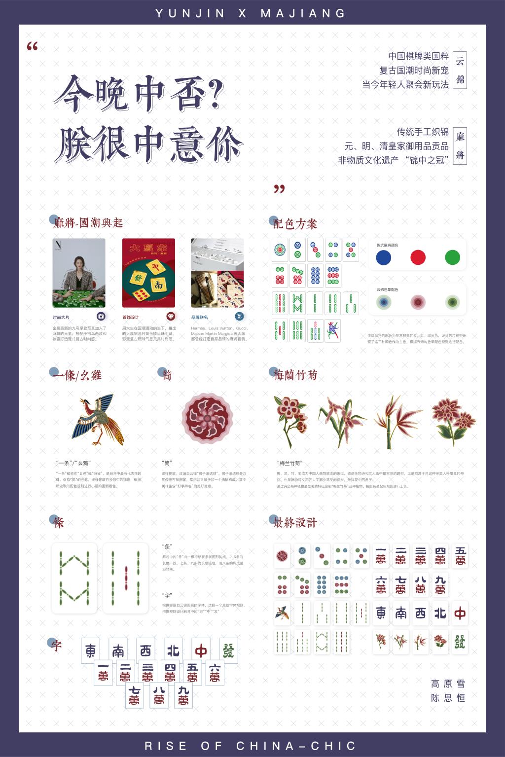 介绍:通过大量的素材及文献分析,整理南京云锦的框架结构、构成方式、元素配色以及寓意内涵并进行提取,形成数字化的数据库。其中群锦、团花、缠枝、串枝为最常见的框架方式,元素构成时注重“四方连续,八方接章”。由于南京云锦多用于贵族和皇家装饰,其配色与皇宫简直配色交相呼应,常用元素为表示吉祥、富贵、廉洁等美好寓意的花鸟神兽等。进行创新设计时,将云锦和中国传统桌面游戏麻将结合,发扬国潮原创。