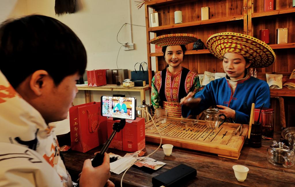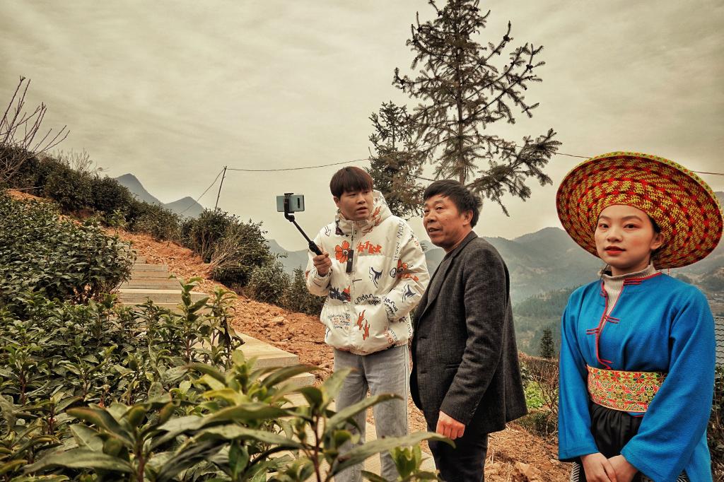 最后一站是谭德友经营的“虎久雾语”茶厂。“小妹妹多大啦?你给介绍介绍这款茶呗?”大家进来时,身着瑶族服装的小霞正在沏茶,她是老谭的小女儿。网友见瑶族小姑娘亲自上镜带货,气氛顿时变得热烈起来。一旁的老谭提议:“我带你们去山上看看我的茶园!”外号“茶痴”的老谭讲起茶来总是滔滔不绝,一路上老谭不断通过直播向网友们介绍茶文化,还不忘打起了“广告”:欢迎朋友们来瑶山旅游品茶!引得众人哈哈大笑。