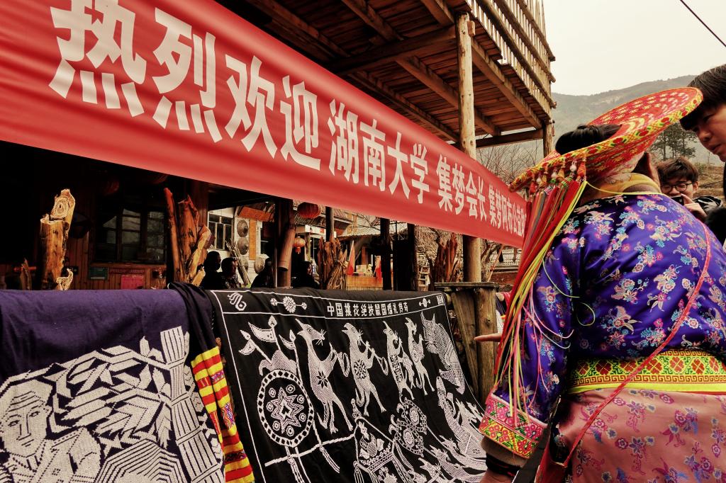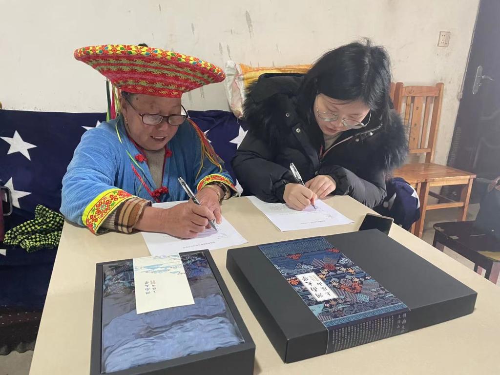 19日下午,设计院师生抵达花瑶白水洞村后,随即赶往奉堂妹老师家中,双方正式签署版权合作和保护协议。这意味着今后设计院与挑花传承人的合作进入了新阶段,双方将合力对花瑶挑花进行生产性保护及传承,通过设计手段提升花瑶挑花的经济价值。两份短短的协议书,跨越了三百公里的山水,意味着持续八年的坚守。大家临走时,奉堂妹老师赶出来,手里提了一袋当地特色“雪莲果”,笑道:“孩子们拿着在路上吃吧!