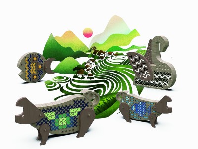 花瑶挑花的技艺通常由当地女性传承,但由于技艺过于精微,易学难精,传统的技艺传承方式往往让孩子们很难获得成就感,从而难以为继。因此,在线下,项目组将花瑶挑花的自由图形创造与模块化积木拼接相结合,创造了益智积木《挑花动物园》,经纬线间精细微妙的针法和图形被放大到积木上,可以自由造型和拼接的积木又拓展了孩子们的想象力。这些产品寓教于乐,成为了乡村美育教学的有效辅助工具。孩子们在玩耍中对本土民族文化的认同感和自豪感都大大提升。除此之外,项目组还设计了基于花瑶文化传承的趣味桌游《瑶趣》、互动益智图书《花瑶历险记》,以及儿童安全教育桌游《放学了》等多款乡村儿童教育产品,期待通过教育游戏的方式探索出新的非遗手工艺的学习方法,平衡非遗手工艺学习的功用价值和手工艺品牌的市场流通价值。乡村儿童美育作品入选2019年迪拜全球毕业设计展。