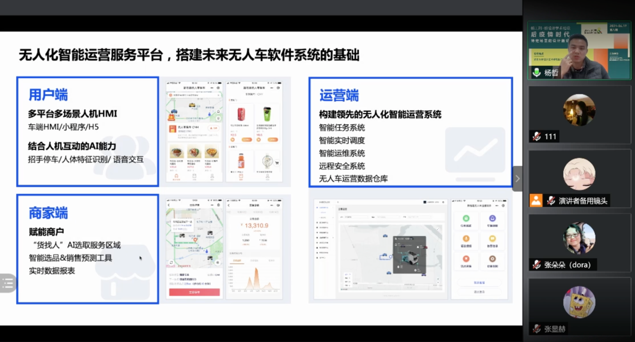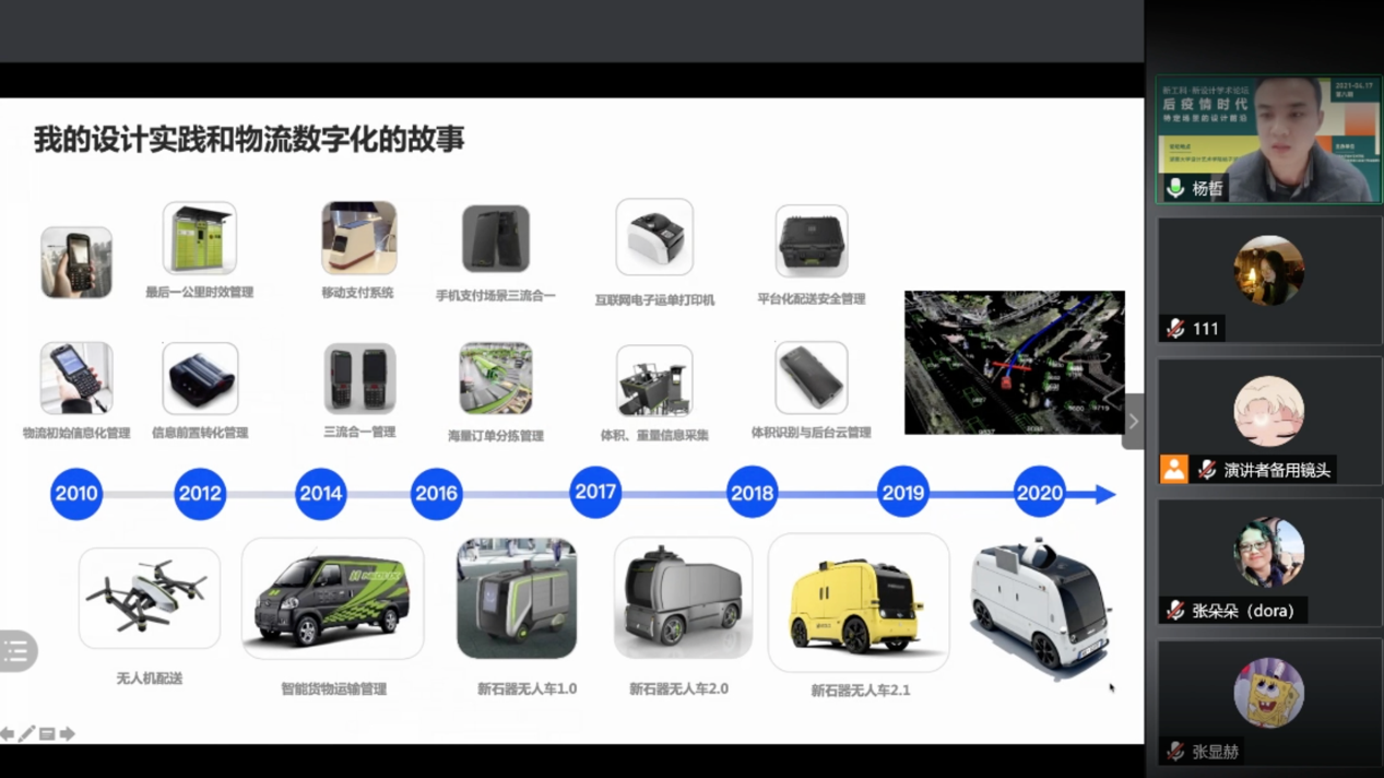 紧接着,杨哲先生进行了主题分享。他从自己为何投身于物流行业说起,讲述了自己十多年来的设计实践和物流数字化的故事。他开发设计的产品包括物流智能终端、快递柜、分拣机器人、无人车等,近期主导设计研发的全球首款量产无人车已正式投入市场并规模化商业运营。他将自己的工作总结为“物质世界的数字化”,致力于中国智慧物流产品和方案的设计研发、资源整合。以设计创新为驱动,他帮助顺丰、中国邮政、菜鸟、京东、美团等企业不断降低物流成本,提高运营效率,推动行业信息化、智能化、安全化的进程。此外,他还分享了新石器无人车赋能战役的实际案例。