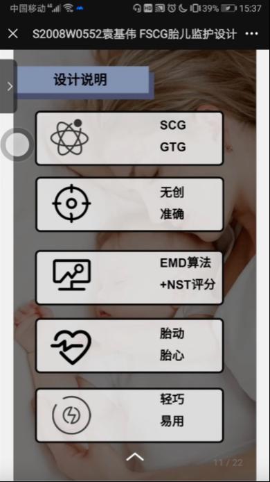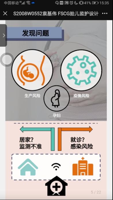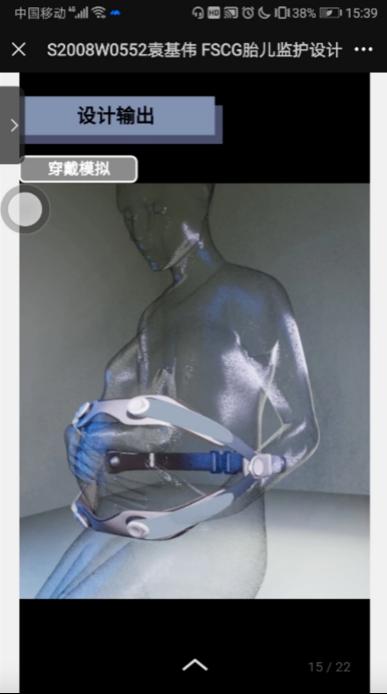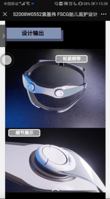 第三位同学的研究方向为智慧出行、交通工具造型、智能产品等。他针对疫情期间妊娠晚期的高危孕妇易被感染,不便往返于医疗机构,以及现有监测设备无法兼顾无创和连续准确等性能的现状,撰写了课程论文《基于互动视角的决策型线上会议体验设计》,通过一种SCG技术与EMD算法相结合的方式,利用NST标准去辅助验证测量标准,创新设计了一款能够帮助孕妇无创连续监测、准确便利、性价比高的可穿戴胎心监测仪。作品为孕妇在后疫情时代提供了更好的居家监测方案。