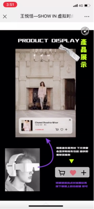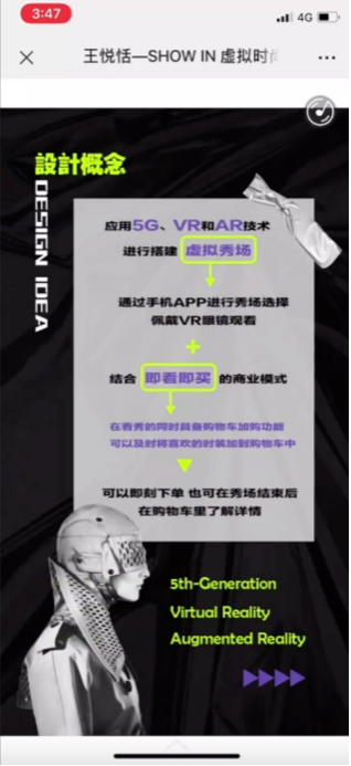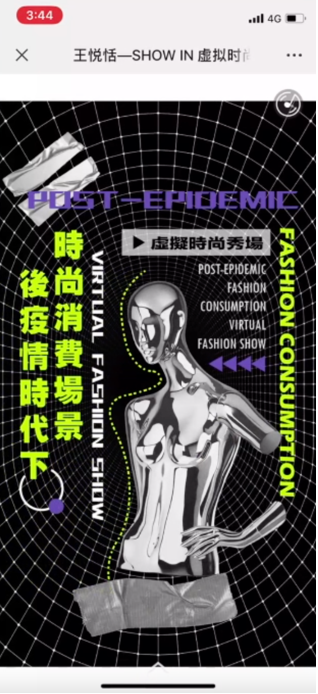 第四位同学的研究方向为数据智能与服务设计。她发现后疫情时代下,各种多媒体投影技术和交互技术已成功的应用于产品展示、服装与虚拟表演等领域,在时装秀场中借助新型载体、投影技术、互动装置等改变了传统时装秀场的受众体验。所撰写的课程论文《虚拟时尚秀场设计》基于对后疫情时代下现有时装秀案例的分析,提出了构建虚拟时装秀的概念。研究适用于后疫情时代的设计方案,即利用新型科学技术完成沉浸式的虚拟时尚秀体验。作品依托对新形态虚拟时装秀的设计方法研究,探索了科技创新给未来虚拟时装秀发布会带来的可能性。