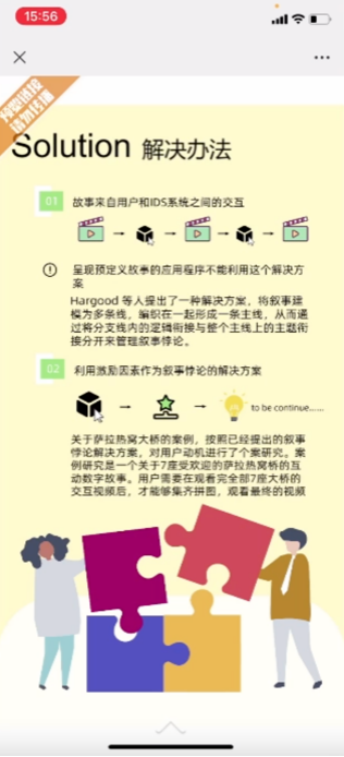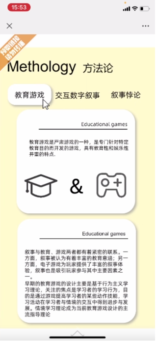 第五位同学的研究方向为文化遗产数字化。她设计了一款基于数字叙事的公共健康游戏并撰写了课程论文《基于数字叙事下的公共健康教育游戏设计》,以简短合理的信息结构和信息呈现,帮助用户了解防疫政策与疫情健康小贴士,潜移默化地唤醒公共意识。作品利用“自由”、“导游”两种游戏模式,尝试借助动力因素以及超叙事的方法,解决交互数字叙事中的叙事悖论问题。该设计尝试引导用户完成了对公共健康知识的学习和接受,从而达到培养公众社会责任感的设计目标。
