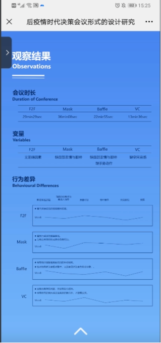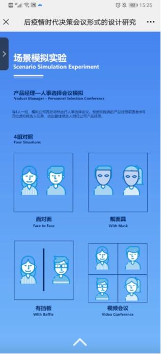 第二位同学的研究方向为智能装备。他探讨了目前线上视频会议在决策型场景中存在的问题,研究互动视角对线上会议系统体验的影响。他的课程论文《基于互动视角的决策型线上会议体验设计》探究了不同形式的决策会议在社会存在和认知负荷方面的差异,提出互动视角是影响决策型会议体验的重要因素。方案基于第一人称互动视角,为线上会议系统研究、提升用户会议体验提供了新思路。