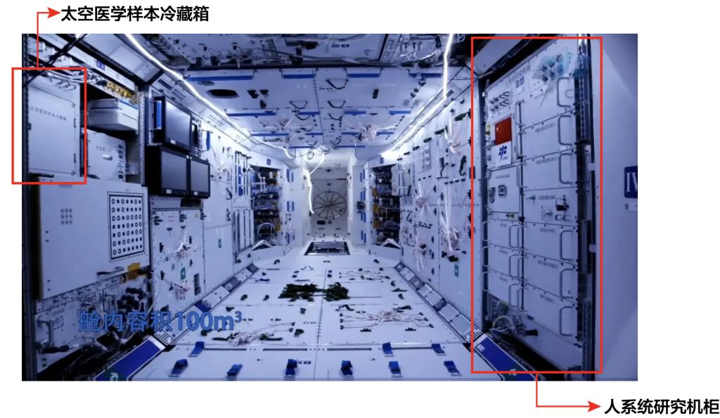 “人系统研究机柜”是在空间站对航天员进行特征生命检测,进行航天医学和空间生命科学试验的科学实验柜,包括了基本认知能力、运动、视觉、力量、失重、心血管、尿液、血清、唾液等测量单元,也包括了医学样本观察、记录、制备装备单元和信息管理单元。“太空医学样本冷藏箱”对人体相关医学样本(如血液、尿液、唾液等)进行冷藏保存。
