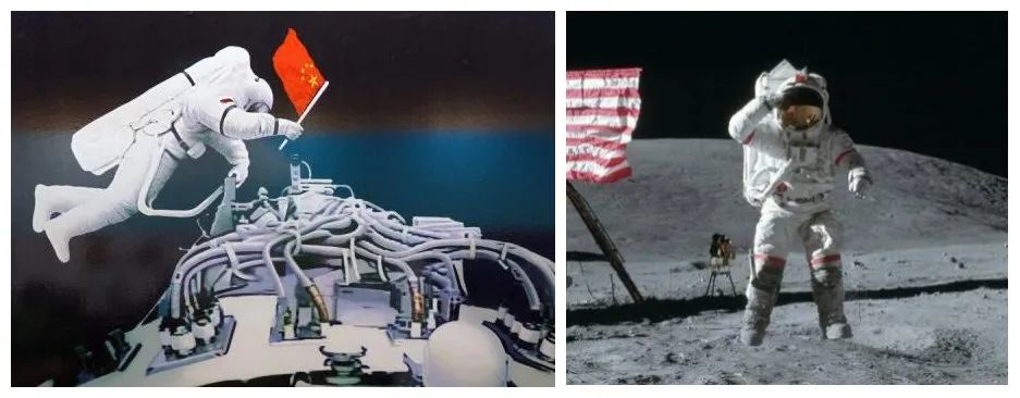 左图为2008年9月27日中国航天员穿舱外服执行出舱任务,右图为阿波罗(Apollo 14)月球出舱任务(图片来源:NASA官网)