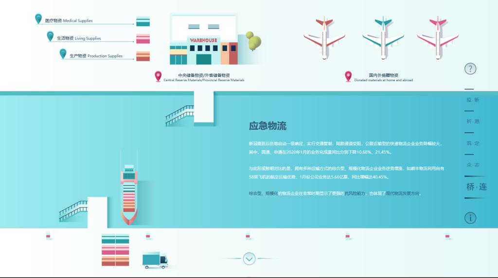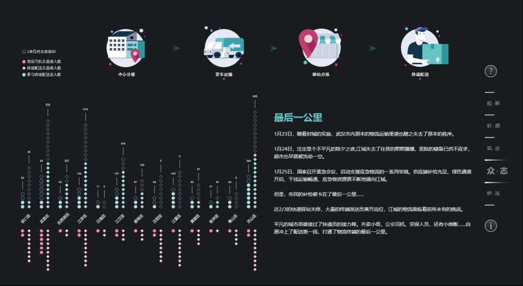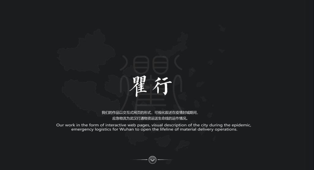 江城武汉素有“九省通衢”之称,该作品以疫情期间武汉封城事件为背景,构建了一个关于应急物流打通武汉城市命脉的可视化互动叙事网页。“瞿”,戟一类的兵器,亦通“衢”,意为四通八达的道路。疫情之下,江城闭,城却不孤。众志成城,各省源源不断的输送物资,以物流之利“瞿”,“行”应急之路。