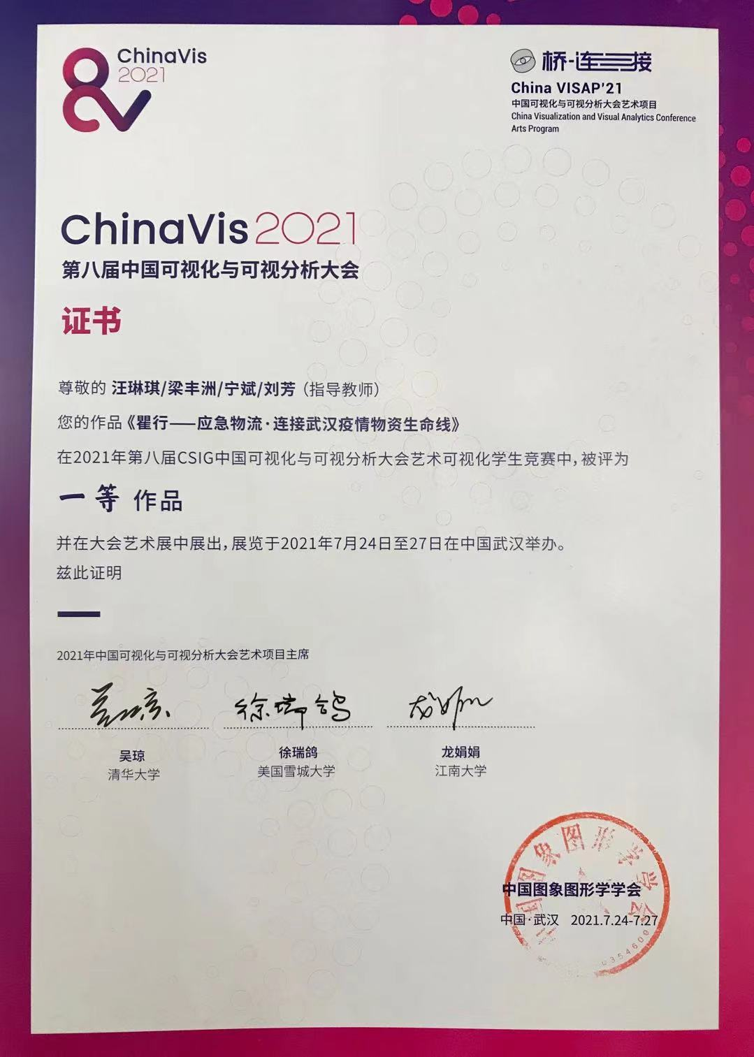 第八届中国可视化与可视分析大会 (ChinaVis 2021) 于2021年7月24日-27日在武汉举行。在球王会刘芳教授指导下,汪琳琪、梁丰洲、宁斌三位同学合作完成的叙事性可视化作品《瞿行——应急物流–连接武汉疫情物资生命线》获得本届中国可视化与可视分析大会艺术可视化员工竞赛一等奖!