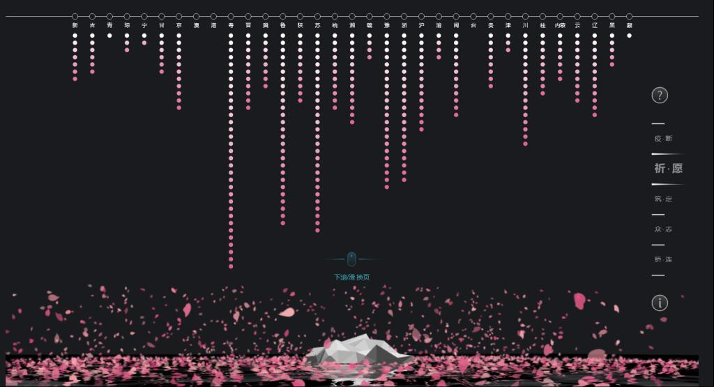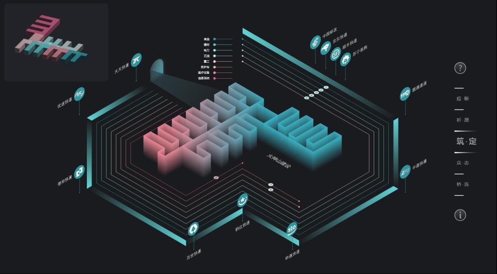网页通过艺术手法,以武汉樱花为线索,贯穿描绘“疫–断”、“祈–愿”、“落–定”、“众–志”、“桥–连”五大篇章。其中,第一篇章“疫–断”展示了武汉封城期间,全国各省份对其物资支援情况;第二篇章“祈–愿”展示了国民对武汉的暖心祝福;第三篇章“落–定”呈现了在火神山医院筹备建造过程中,中国各大行业企业及时响应,按需时序性供应各类物资支援建设;第四篇章“众–志”展示了在末端配送过程中,武汉来自各行各业的市民自发承担最后一公里的运输任务,完成了特殊时期整个物流行业闭环的连接;第五篇章“桥–连”展开呈现应急物流作为特殊时期的桥梁,如何连接着祖国的每一座城市。《瞿行》旨在传播武汉封城不孤城背后的数据故事,以及祖国紧密连接的民族凝聚力。